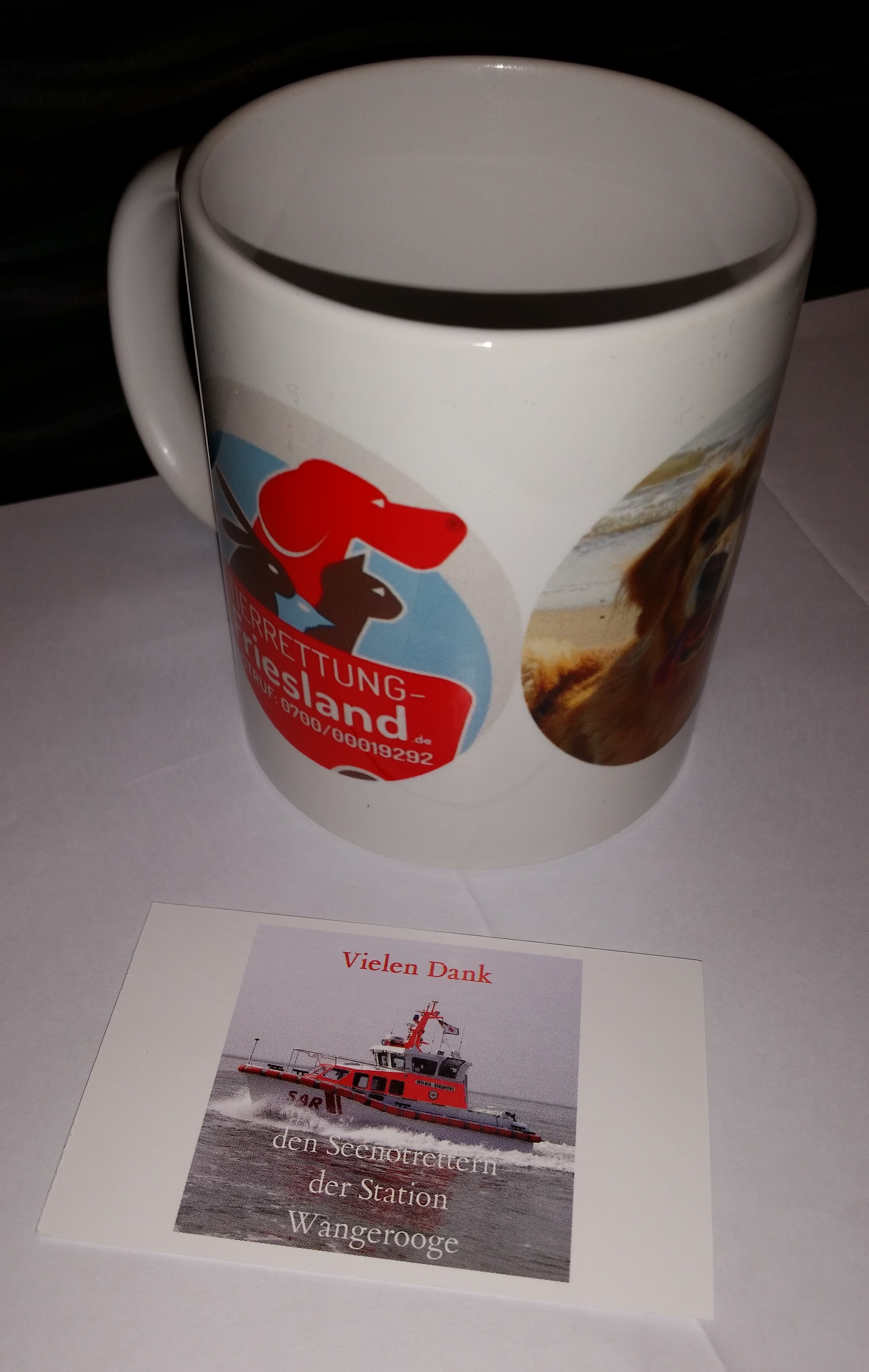 Endlich tritt die letzte Tasse ihre Reise an! Vier solcher Tassen gibt es; nicht mehr nicht weniger....sieh stehen für die vier besonderen Menschen, welche Montys Rettung erst möglich gemacht haben. Sie sollen ein Symbol des Dankes darstellen und sind nur für diese vier besonderen Menschen bestimmt. Die erste Tasse hat Jörg Schlüter von der Tierrettung Friesland erhalten. Zwei weitere Tassen wurden nach Wangerooge an Vormann Roger Riehl und Rettungsmann Sascha Piontkowskyj verschickt. Die vierte Tasse hat ihre Reise nach Bremen zur Seenotleitung der DGzRS angetreten und ist dort für den Wachhabenden der Nacht vom 01. auf den 02.08.2015 bestimmt. Er hat es erst möglich gemacht, dass die Rettungskette angelaufen und so super funktioniert hat. |